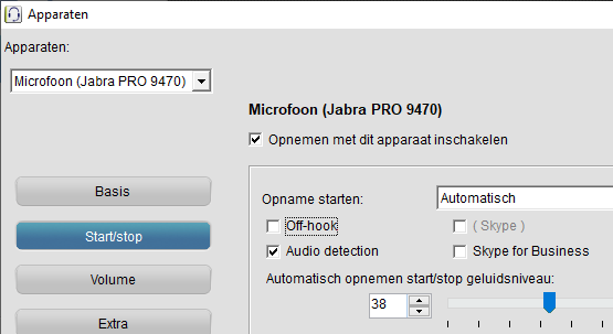 Automatisch starten en stoppen stel u op deze manier in: Zet Opname starten op Automatisch en vink de “Audio detection”-optie niet aan. Met deze instellingen start en stopt de Oygo een opname als u een telefoongesprek met de Jabra PRO 9470 start of stopt. De andere opties zijn “handmatig opnemen” en “opnemen met behulp van audio volume detectie”. Ze worden hieronder besproken.